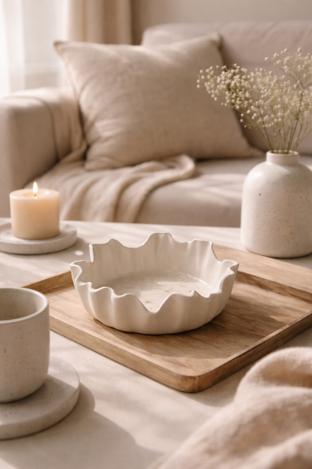 Κάθε τεμάχιο είναι επιμελώς πλάσμένο στο χέρι από υψηλής ποιότητας πηλό, με απαλό, οργανικό φινίρισμα που αναδεικνύει την υφή και τις κυματιστές γραμμές του σχεδίου, δημιουργώντας μια ήρεμη και λιτή αισθητική.