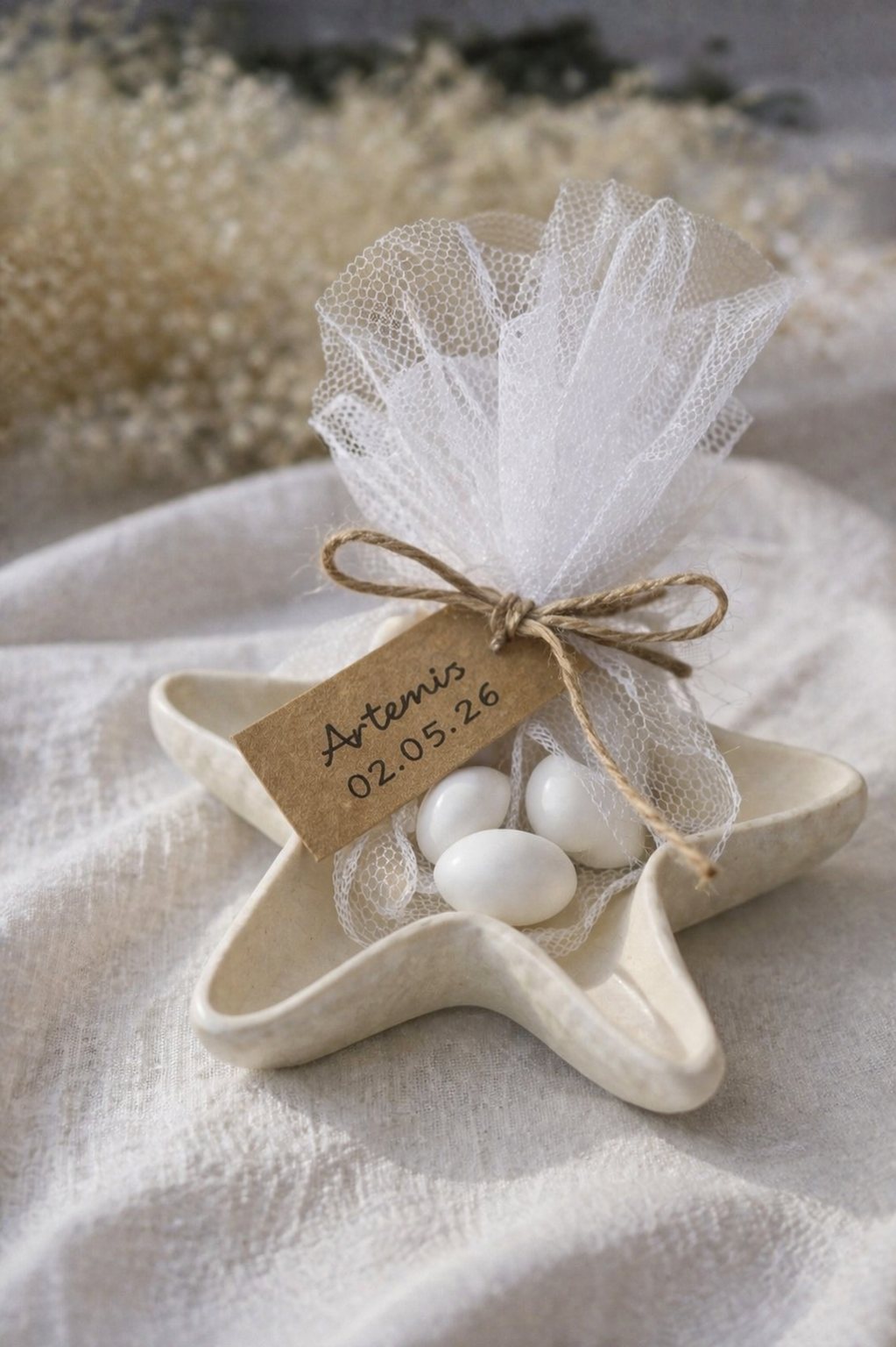 Μοναδικές, χειροποίητες μπομπονιέρες σε σχέδιο κοχύλι και αστερίας, με διακριτικό άρωμα baby powder που θα σας ταξιδέψει σε καλοκαιρινές αναμνήσεις